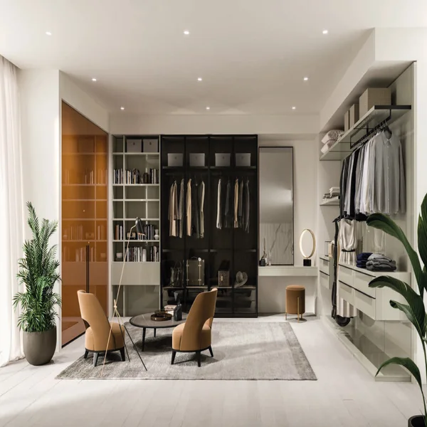 تضفي الأبواب، بخطوطها النظيفة والجذابة والمصطفّة على نفس المستوى، على غرفة تبديل الملابس مظهراً مدمجاً للغاية، بدون طبقات مزدوجة.